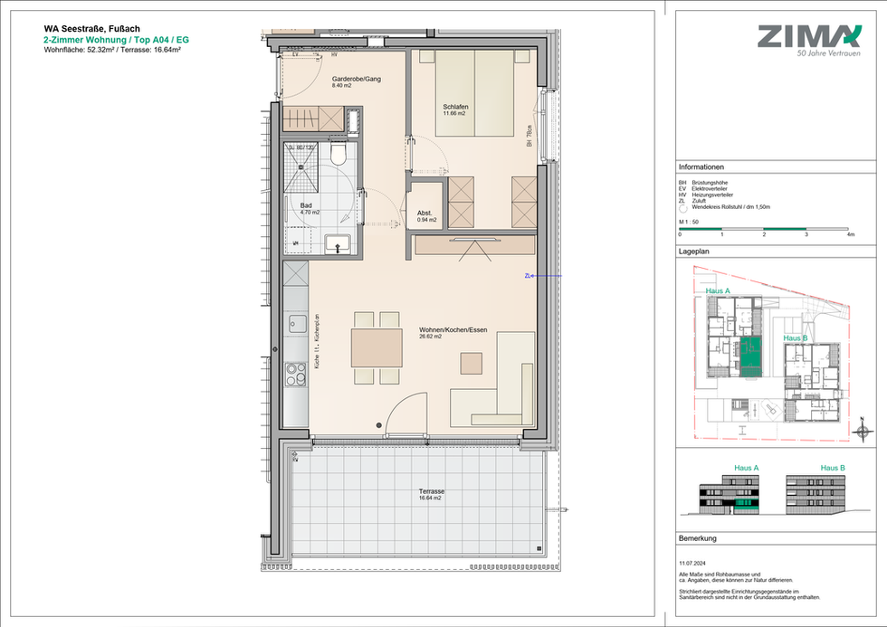 Auf einer großzügigen Wohnfläche von 52 m² verteilen sich zwei helle Zimmer, ideal geschnitten für ein gemütliches Zuhause. Das Herzstück der Wohnung ist die offene Einbauküche, die nahtlos in den Wohnbereich übergeht und mit hochwertigen Fliesenböden ausgestattet ist.